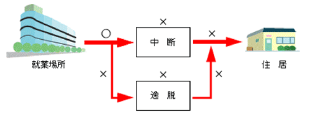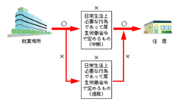 ・逸脱:通勤経路から外れて、通勤とは関係ない目的で合理的な経路からそれること。